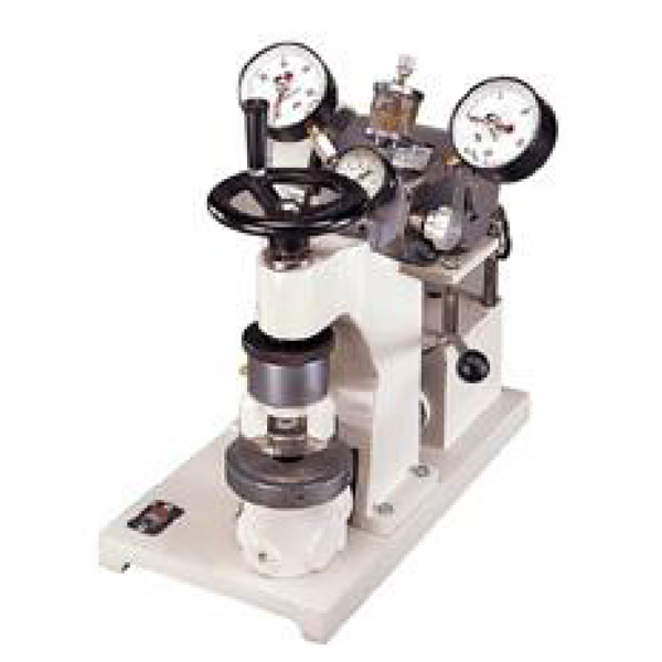 Clamp the specimen tight between the plates with rubber diaphragm placed under the specimen. Exert pressure on the diaphragm for it to expand. The gauge records the maximum pressure needed to burst the specimen as its bursting strength. Common types of material are paper, textile, leather, etc.